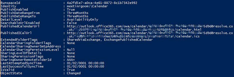 The first task is to allow anonymous access to the calendar free and busy time (so anyone with the URL can see the calendar or add it in Outlook, but can’t see the meeting details). You can do this by connecting to 365 using PowerShell and running the following command: