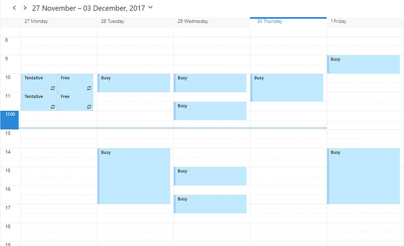 When opening the calendar in a browser, you can see from the screenshot below that free and busy time is visible, but not the meeting details or attendees: