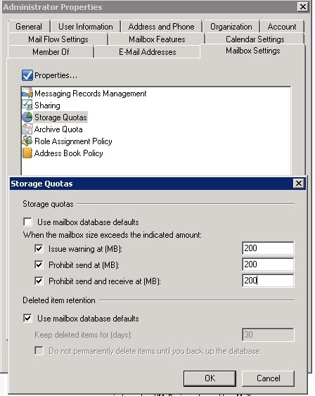 4)      Under the "Mailbox Settings" tab, Double click the "Storage Quotas" properties