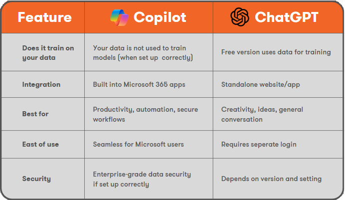 Why bother with Microsoft Copilot when you can use ChatGPT for free? That’s an interesting question, and one we hear a lot. AI tools have quickly become an essential part of our lives, both at work and at home and for good reason. They help us work smarter and faster. However, there are some important security considerations, especially when using the free version of ChatGPT for work.