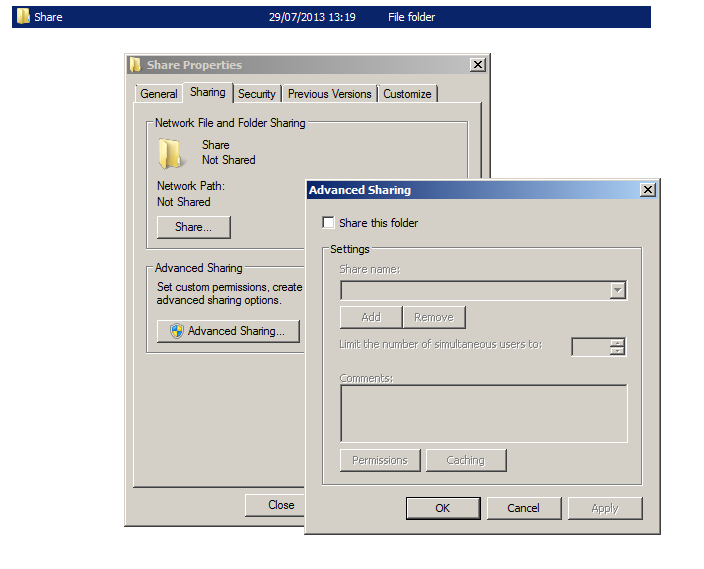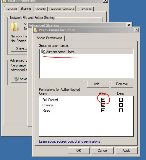 Choose, Share this folder, and then choose a share name, it can be anything you want, but I'd recommend using a name without spaces (use an underscore "_" instead). Next, click on Permissions, select Everyone and click Remove. Finally, click Add and type Authenticated Users, then click OK. Put a tick in Full Control for Authenticated Users as such: