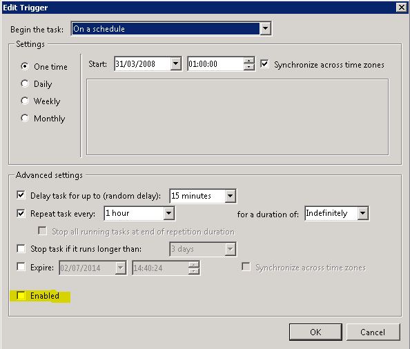 On the left hand side of the RacTask Properties window (above), you'll notice the trigger is set to "one time". All you need to do is double click on the trigger to edit it, and click the Enabled tick box at the bottom. (see below)