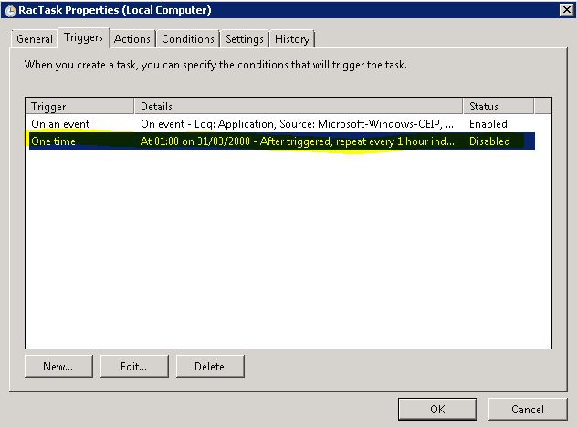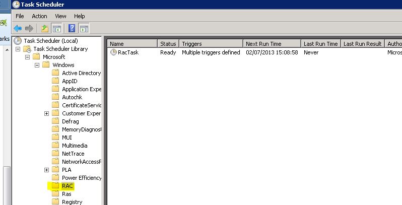 Right click on RacTask under the Name column on the right hand side and go to Properties, and select the Triggers tab.