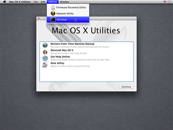 - Soon you will see a screen titled OS X Utilities. Don’t click on anything here. Click on the menu barf at the top and select Utilities > Terminal.