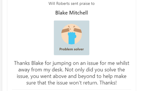 Aside from the monthly Resolve team meeting, we also partake in celebrating excellence throughout the month via our Microsoft Teams Chat. In Teams we have a specific ‘Celebrating Excellence’ thread where staff are encouraged to give colleagues a special shout out for anything excellent they have done. Comments can also be accompanied by cute little badges such as Praise, Awesome, Team Player and so on…