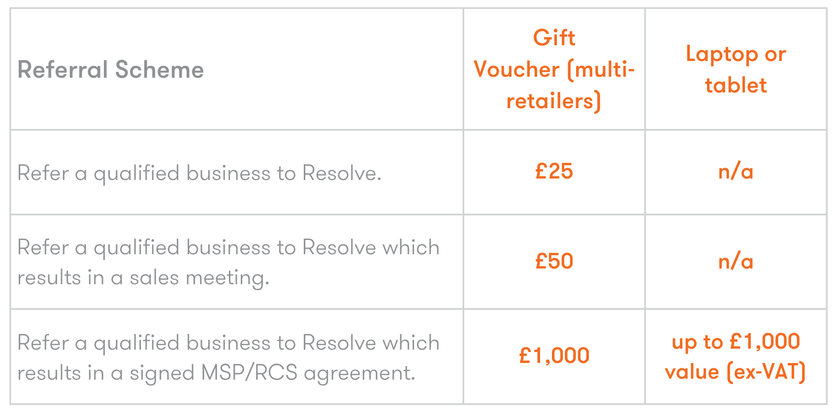 It’s very straightforward: just send an email introduction to solutions@resolve.co.uk and connect us with the referral contact. The great news is, if the original referral becomes a customer you will receive a voucher at every stage of the process, and – if they don’t – you still receive £25. Win-win!